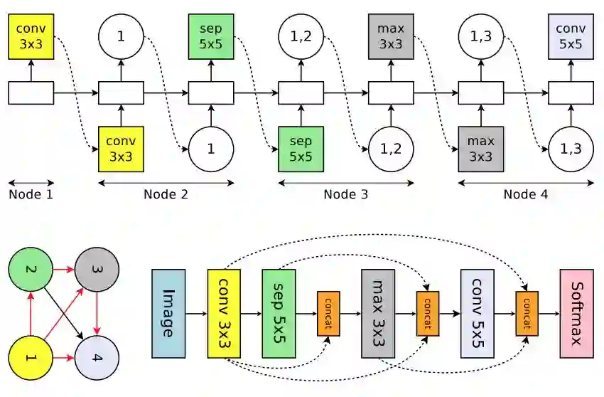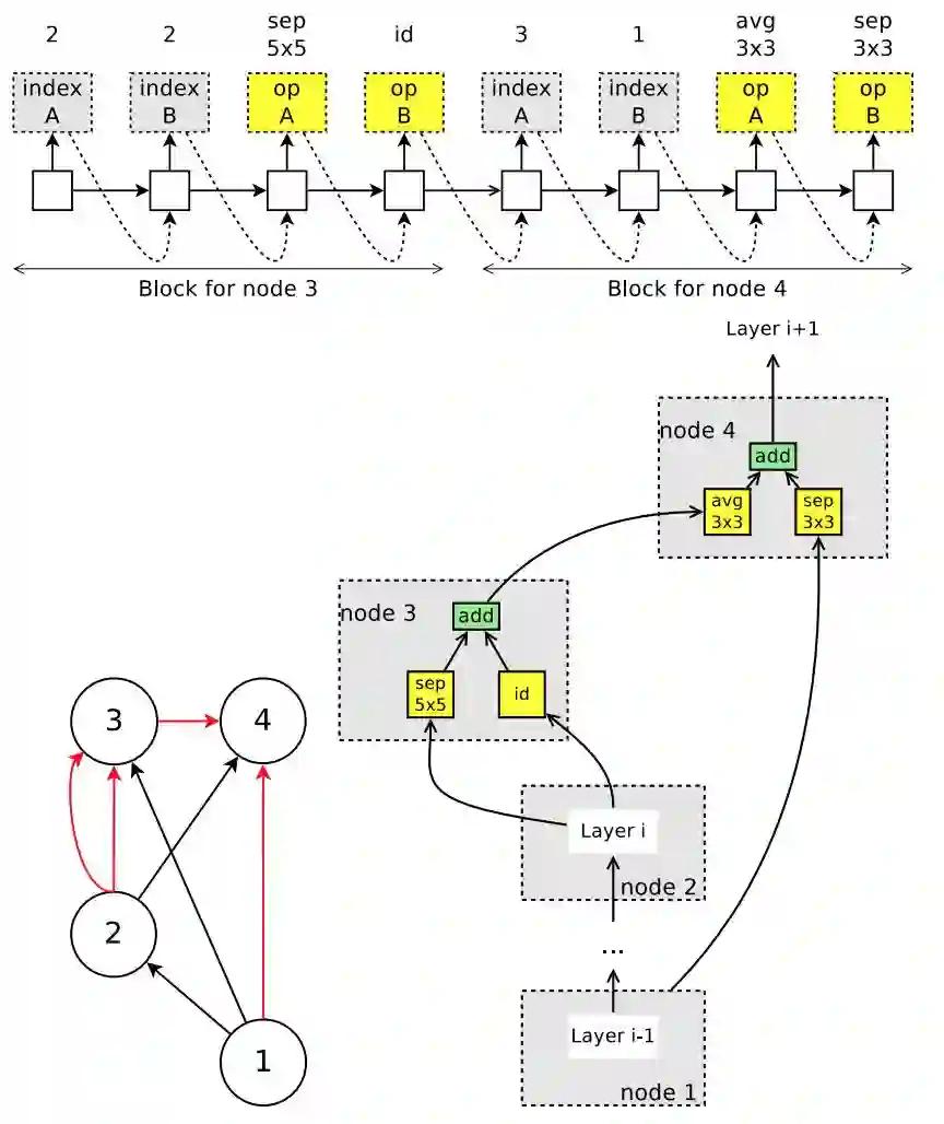 图 3:搜索空间中一个循环单元的实例运行,该空间带有 4 个计算节点,表征卷积网络的 4 个层。顶部:控制器 RNN 的输出。左下:对应于网络架构的计算 DAG。红箭头表征激活的计算路径。右下:完整的网络。虚线箭头表征跳跃连接。