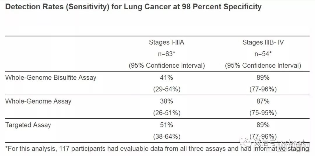 结果表明,在早期(I-IIIA期)肺癌患者中,检测率为38%~51%(98%特异性);在晚期肺癌(IIIB-IV期)患者中,检测率为87%~89%,具体如下表所示: