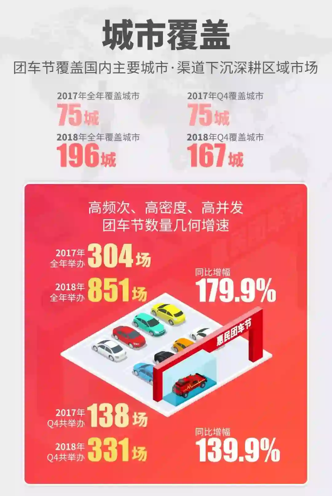 值得一提的是,其所构建的合作网络涵盖了吉利、奇瑞、宝马、奔驰、凯迪拉克等众多国内外知名汽车品牌,不仅能给用户提供充足的数量供应,也将于品牌、车型维度提供更多选择,带来量与质的双重保障。基于此,团车节的推广也更游刃有余,2018年Q4举办场次同比已从全国75个城市138个场次增长至全国167个城市331个场次,增长可谓显著。