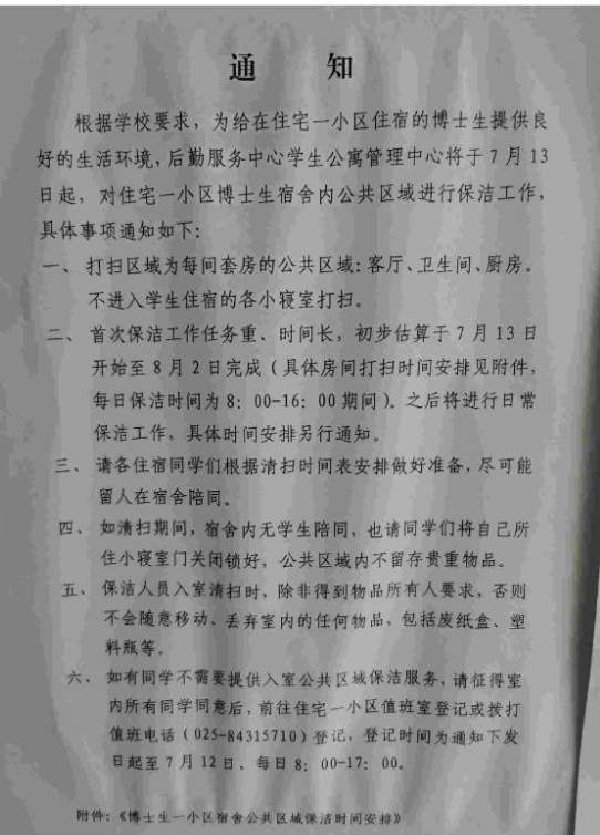 不过好在,学校后勤处很快注意到了网上的舆情,也迅速的给出了解决方法。将派专人对博士生学生公寓进行打扫,为在小区住宿的博士生提供良好的生活环境。