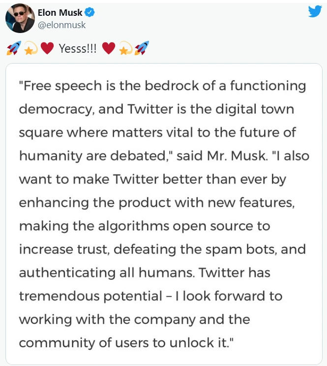 经过了几周的酝酿,深思熟虑后,推特公司董事会于当地时间4月25日公开一致接受了440亿美元的收购要约。