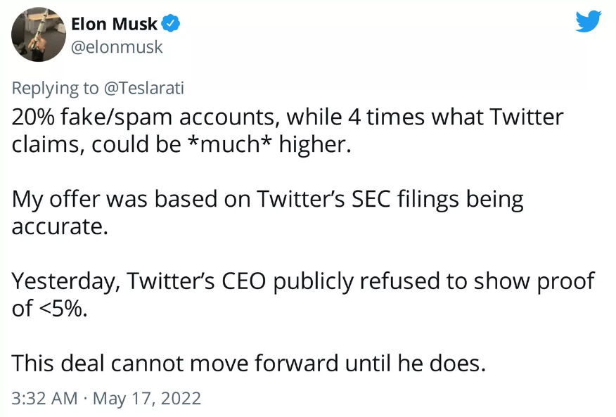 5月中旬,马斯克宣布暂缓收购案,因为需要等待确认推特的机器人虚假账户含量确实少于5%。该决定在市场引发对收购案的担忧,在之后几分钟内,推特股价从45美元直接跌至40美元以下。