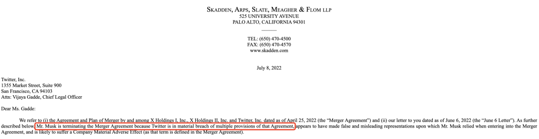 根据昨日晚间披露的一份监管文件,代表马斯克的一名律师在给推特的高级律师的信中声称,马斯克打算要终止这笔交易,因为