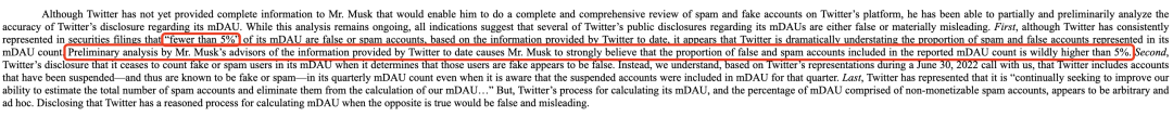 文件中提到,「近两个月来,马斯克先生一直在寻求必要的数据和信息,以对推特平台上的虚假或垃圾账户的普遍性进行独立评估,这些信息对推特的业务和财务表现至关重要,是完成并购协议所设想的交易的必要条件。」