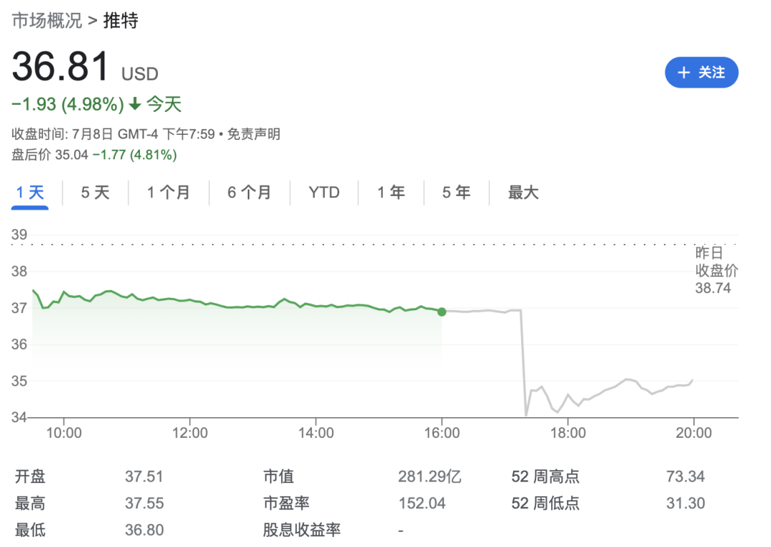 消息传出后,推特股价在周五的盘后交易中立即下跌了近6%,在