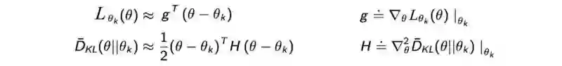 正如我们之前提到过的,下界函数M应该是易于优化的。事实上,我们使用泰勒级数(Taylor Series)来估计 L函数 和 KL距离(KL-divergence)的平均值,分别用泰勒将L 展开到一阶 ,KL距离 展开到二阶: