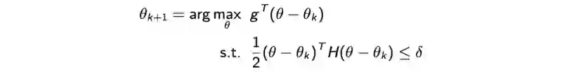 在信任的区域之中,我们用 δ 变量 限制我们的搜索区域。我们在前一章中用数学证明过,这样的区域可以保证在它达到局部或者全局最优策略之前,它的优化策略将会优于当前策略。
