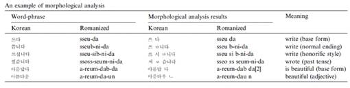 韩语词汇在句中以空格分隔,其由若干谚文构成,谚文数量可以是一个或者多个。下图给出了一些韩语词形态学变化和对应翻译。