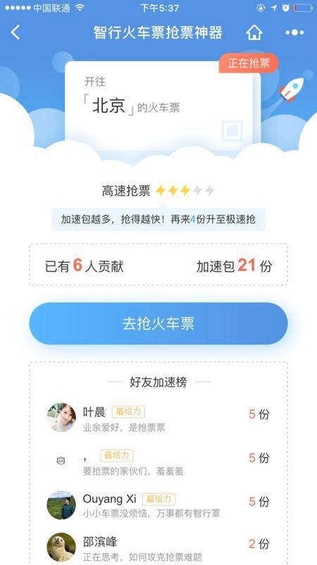 页面简洁,抢票功能强大。依托 APP 庞大的用户基数和好友分享加速的功能。临近十一,智行火车票的排名表现非常抢眼。即将上线的好友加速功能,更是把小程序的强工具类和微信生态社交属性完美结合。