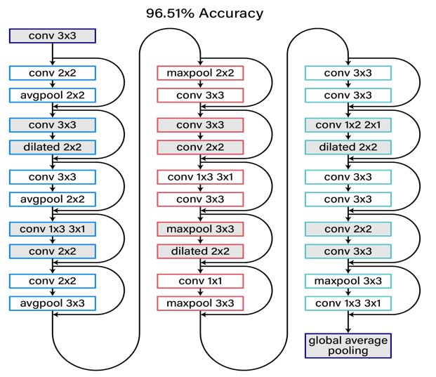 图 4 是一个搜索到的结构,大概是一个 30 层的网络,网络的每层都有具体搜出的操作,大概可以达到 96.5% 的准确度,已经超过大部分的人类专家设计的网络。后来我们做进一步的改进。最新的结果就如图 5 所示,横向对应不同的网络结构,纵向对应它们的准确度,这里面有 VGG,ResNet, and DenseNet 等不同的网络结构。那么人类专家最好的准确度可以达到 97.1%,就是通过 shake_shake_64d_cutout 的方法,应该是在 ResNet 上得到的。Google 最早一版的准确度在百分之九十五点几,在去年的 AdaNet 进一步提高到 97.6%;AutoDL 现在最好的结果是第一版的 98.01%,错误率低于 2%,到现在仍保持最好的记录,也就是说我们基本上保持了 6 个月的准确性,可以跟 Google 正面竞争。