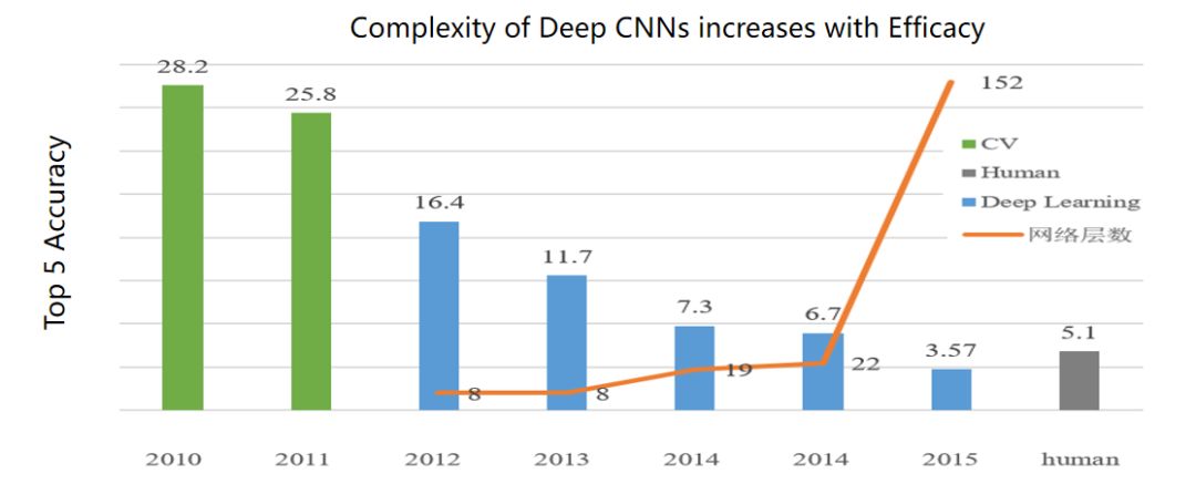 这听起来不太可能,我们看一个例子,大家可能都比较熟悉,横轴是时间,纵轴是错误率,从 2012 年开始,错误率从百分之二十几到百分之十几。当 Deep Learning 出来时,可以看到一下子降了 10%,当时有人打电话说,Hinton 是不是能够事先知道 testing data?你是不是 cheat 了?Hinton 说我干了一辈子了,不能干这种事情。后来 2015 年错误率是 3.57%,为什么 3.57 得出来?人类专家先不说累不累,都是看一百万张图片,差不多是 5% 的错误率,深度学习在感知层面是可以超过人类专家,但在认知层面还没有全面超过人类专家,大家要有一个基本的认识。认知层面包括推理逻辑这些,感知层面至少在图像分类上确实超过人类专家。