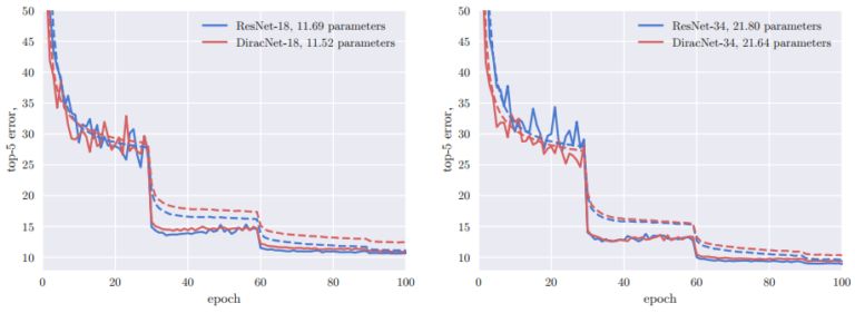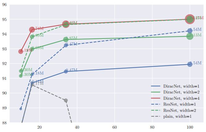 在同等深度的情况下,DiracNets普遍需要更多的参数才能达到和ResNet相当的准确率: