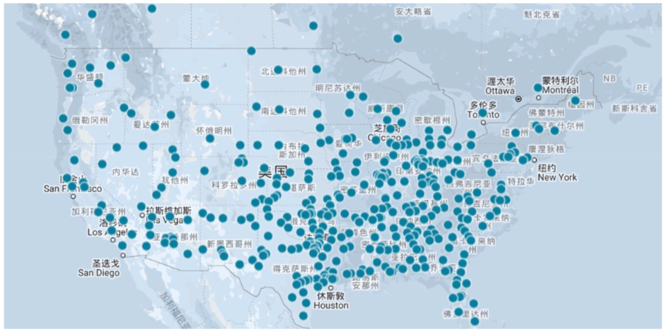 尼古拉计划于2028年前在美国建成的加氢站分布图