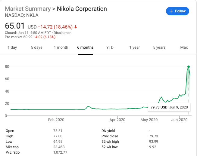 尼古拉汽车(Nikola Motor),一个连名字都和特斯拉“撞车”的造车新贵(他们分别取了发明家尼古拉·特斯拉的名和姓,作为公司名称),上市仅一周,股价就翻了一番,市值一度站上 300 亿美元,超越了福特。同时,公司创始人 Trevor Milton 身家也暴涨至近百亿美元。