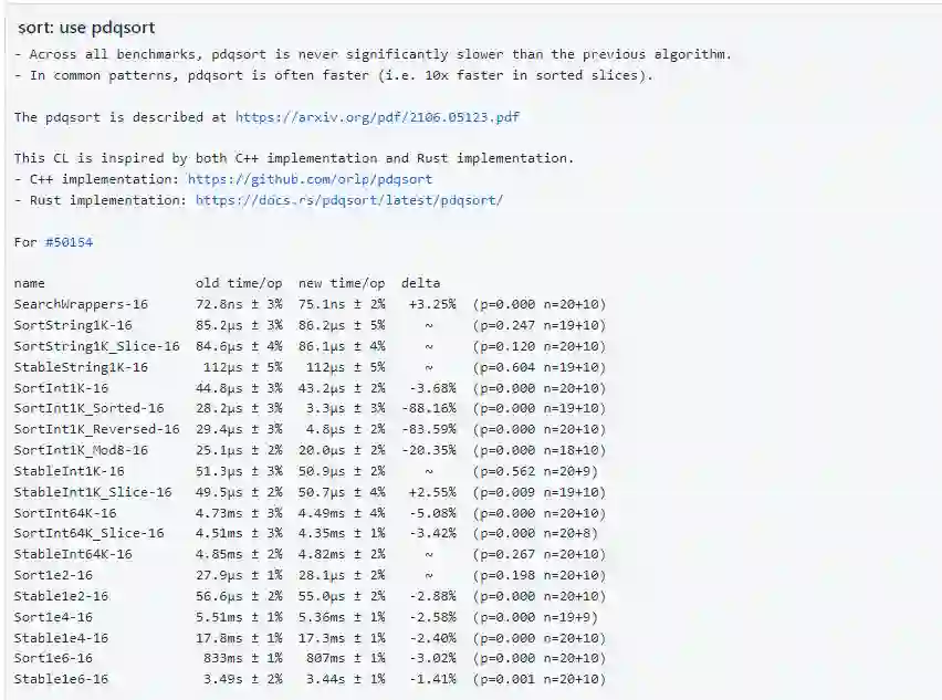 目前,Go 仓库的最新 commit 中介绍了 pdqsort 的相关功能描述: