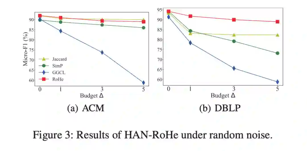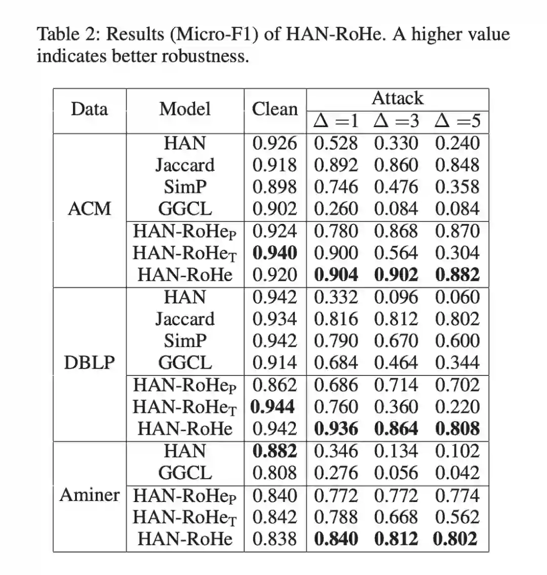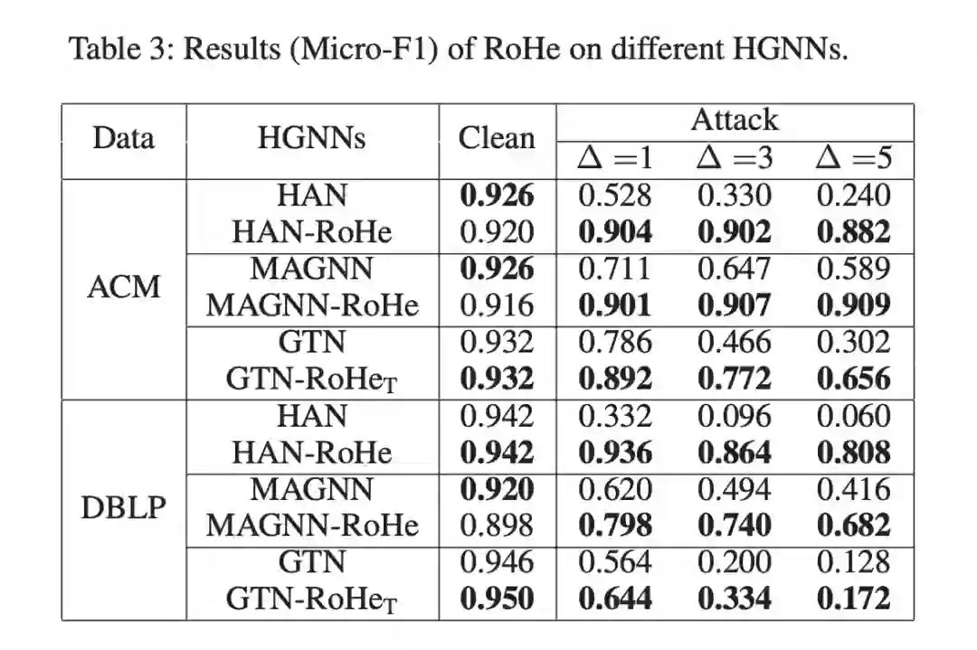 RoHe 在 HAN 上的对抗防御效果实验:在三个数据集上的不同程度的攻击实验证明了 RoHe 的防御能力。其中 Δ 含义是对抗攻击的边数。