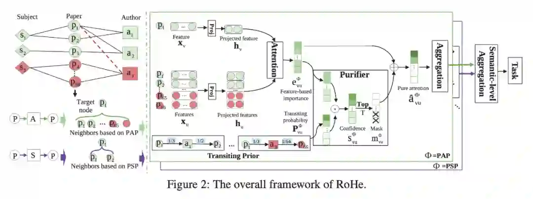 为了减少扰动的放大效应,RoHe 引入了一个转移概率作为我们的净化器的先验,降低对抗 hub 邻居的置信度。然后,基于转移概率和特征相似性对感受域进行收缩,mask 掉置信度很低的邻居,解决了软注意力机制不能彻底消除对抗边的问题。最后,利用净化后的注意力聚合所有元路径的邻居信息,将这些元路径进行语义级聚合,最终生成下游任务的节点嵌入。图 2 是 RoHe 的整体框架。