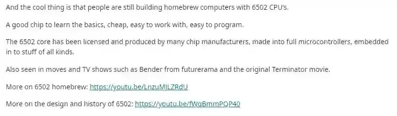 6502绝对是一个学习芯片基础知识的绝佳之选!它价格便宜、易于使用、易于编程,6502内核已被许多芯片制造商许可和生产,制成了完整的微控制器,并嵌入到各种电子设备中。