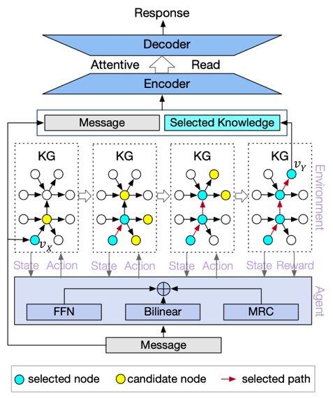 然后使用这个扩充的知识图来辅助进行知识选择和后续的回复生成。