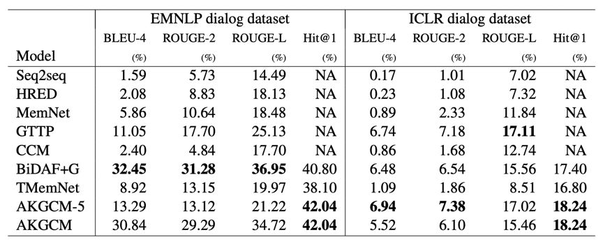 可以看到,AKGCM模型在人工评估中有比较明显的优势,但是在自动评估指标上,除Hit@1(反映知识选择模块从背景知识集合中选取所需知识的准确程度)之外,AKGCM模型的结果并不是一致最优。