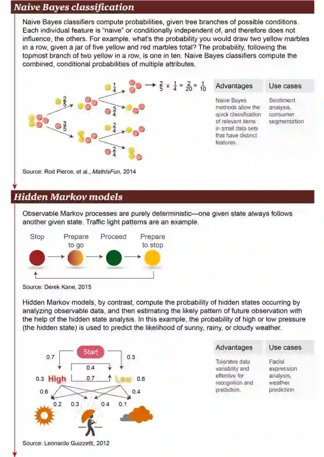 4. 朴素贝叶斯分类(Naive Bayes Classification):朴素贝叶斯分类器用于计算可能条件的分支概率。每个独立的特征都是「朴素」或条件独立的,因此它们不会影响别的对象。例如,在一个装有共 5 个黄色和红色小球的罐子里,连续拿到两个黄色小球的概率是多少?从图中最上方分支可见,前后抓取两个黄色小球的概率为 1/10。朴素贝叶斯分类器可以计算多个特征的联合条件概率。