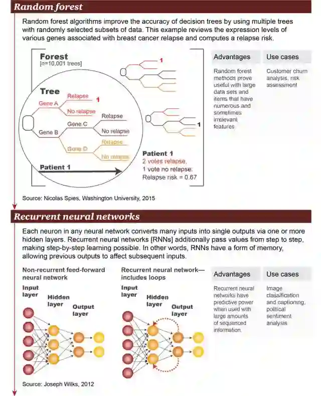 6. 随机森林(Random forest):随机森林算法通过使用多个带有随机选取的数据子集的树(tree)改善了决策树的精确性。本例在基因表达层面上考察了大量与乳腺癌复发相关的基因,并计算出复发风险。