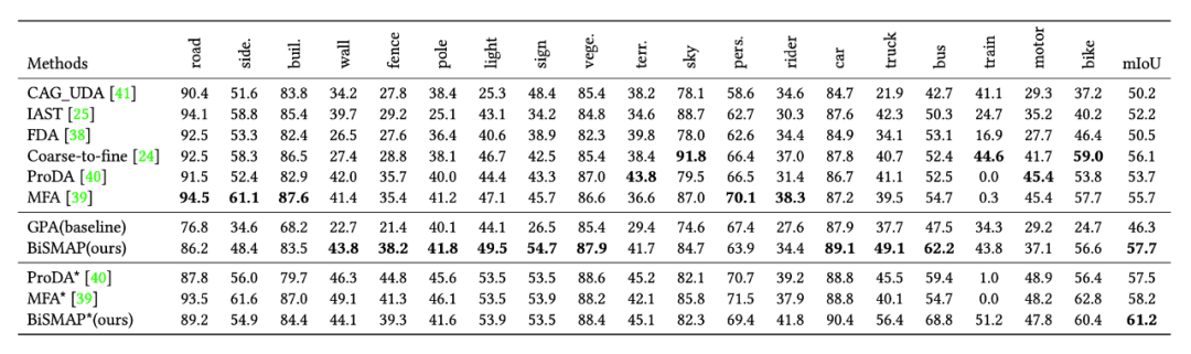 与其他 SOTA 方法比较,本文方法在 GTA5->Cityscape 任务上蒸馏前取得了 57.7 的性能,蒸馏后达到了 61.2 的性能,达到了 SOTA 的效果。