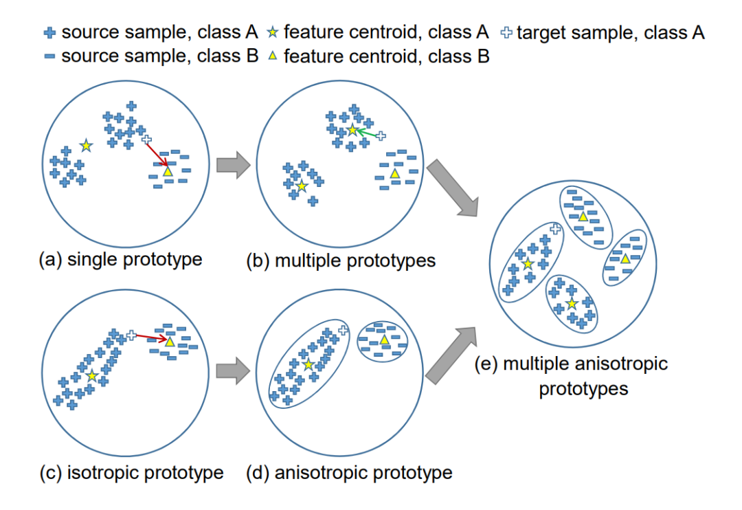 这里 D(x) 衡量了任意一个源域特征到目标域的距离,A 代表聚类出来的目标域原型。