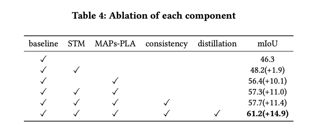 在预训练阶段,源域可迁移图(STM)的引入相比 baseline 带来了 1.9 的性能增益,自训练阶段多重各向异性原型带来了 9.1 的性能提升。综合一致性正则和蒸馏技术,最终的性能达到了 61.2.