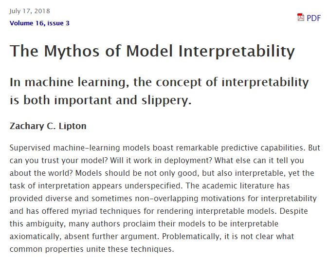 7月17日,加州大学圣迭戈分校(UCSD)博士、卡内基梅隆大学(CMU)计算机科学助理教授Zachary C. Lipton在ACM Queue上发表了题为《The Mythos of Model Interpretability》的文章,讨论了监督式机器学习预测模型的可解释性问题。Lipton在文中试图明确“可解释性”的定义,并对“可解释性”进行分类,并提出了一个重要观点,认为线性模型的可解释性并不一定高于深度神经网络(DNN)模型。