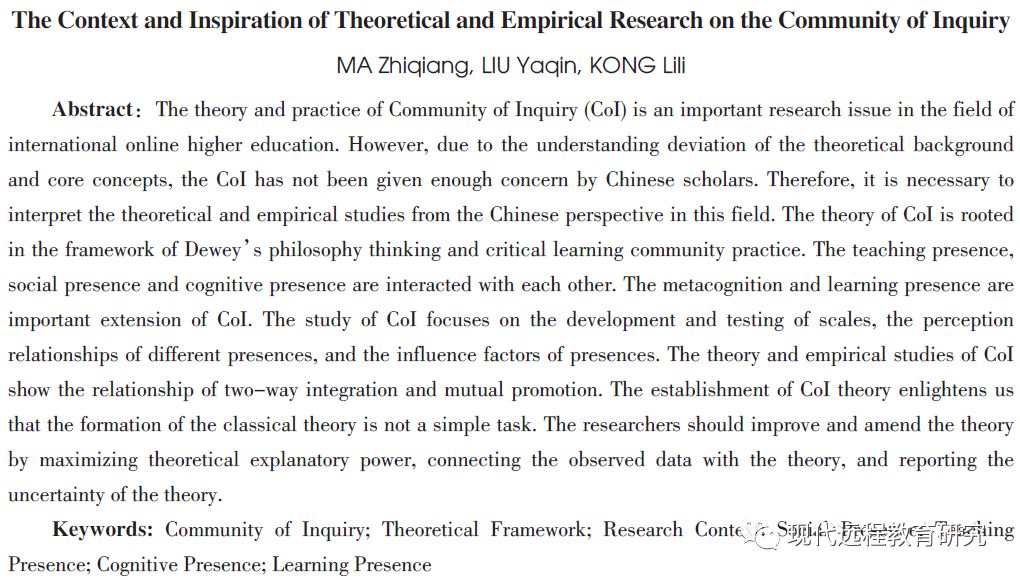 [15]Garrison, D. R., & Arbaugh, J. B. (2007). Researching the Community of Inquiry Framework: Review, Issues, and Future Directions[J]. The Internet and Higher Education, 10(3): 157-172.