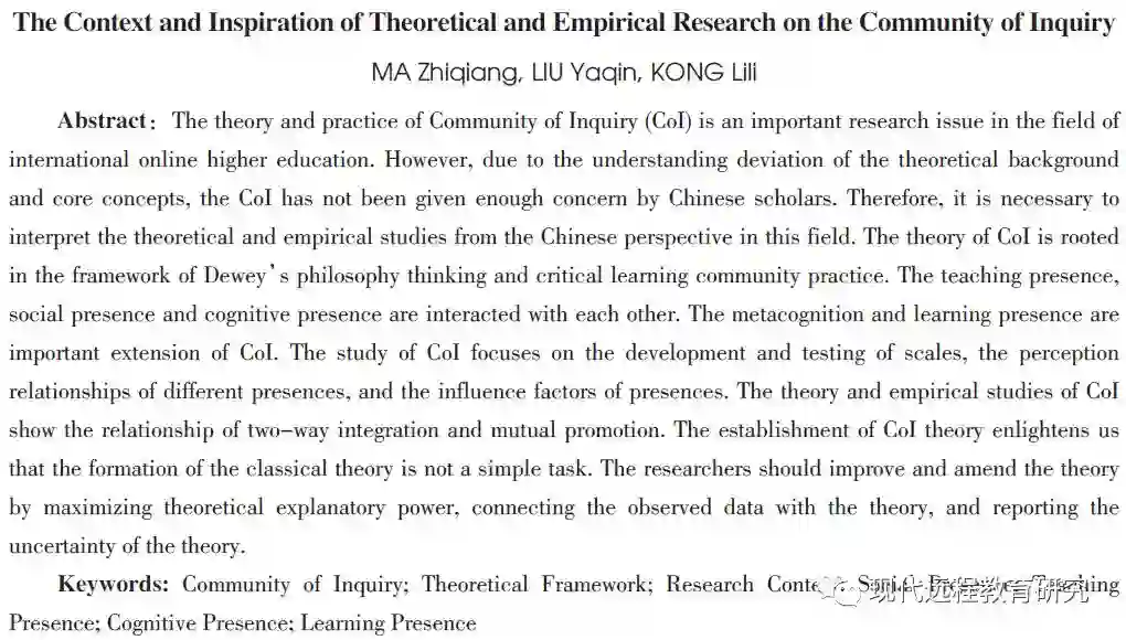 [18]Garrison, D. R., Anderson, T., & Archer, W. (2010). The First Decade of the Community of Inquiry Framework: A Retrospective[J]. The Internet and Higher Education, 13(1-2): 5-9.