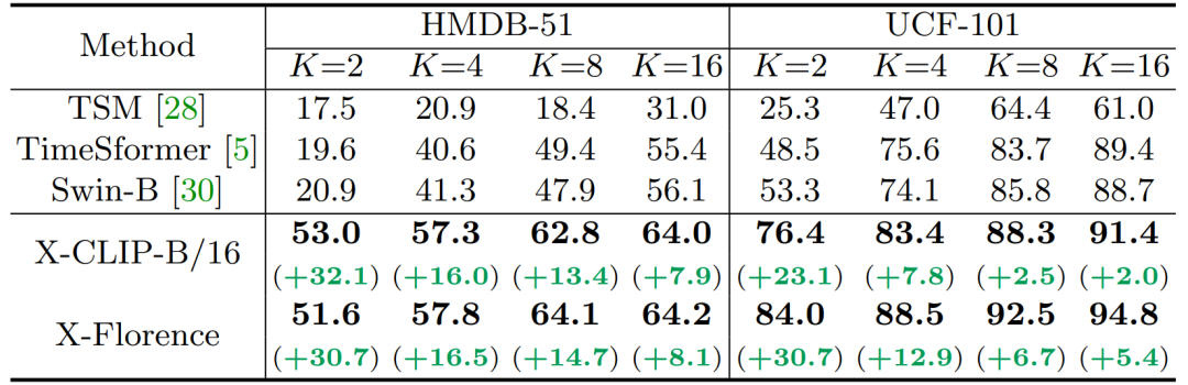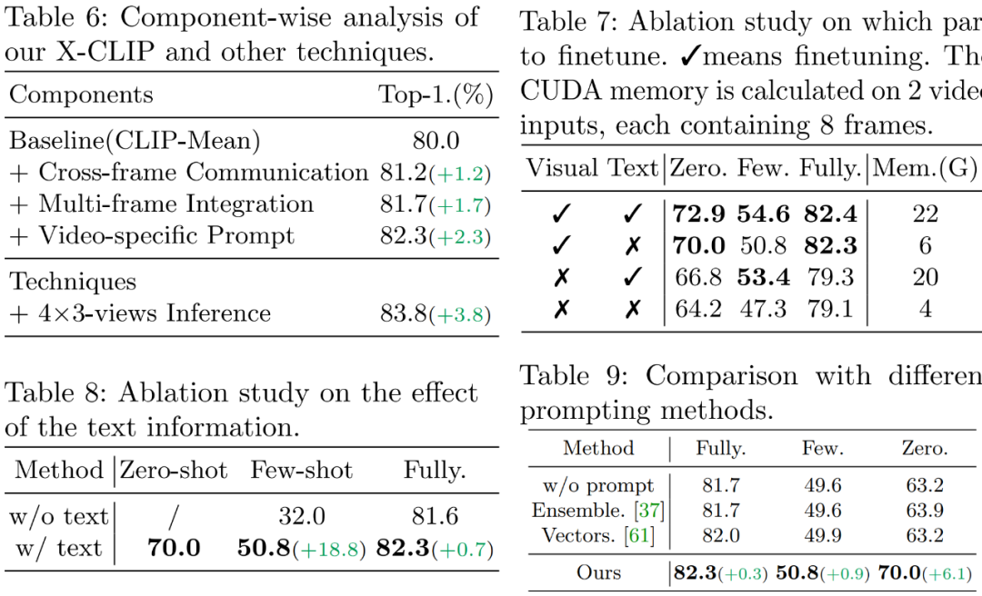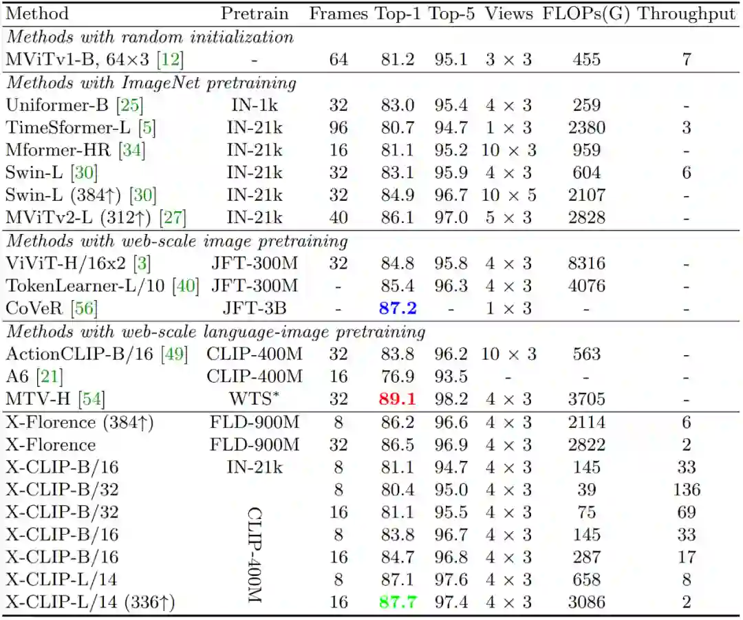 X-CLIP 在 FLOPs 更小的情况下领先于其它方法,这得益于提出的视频编码器的高效性