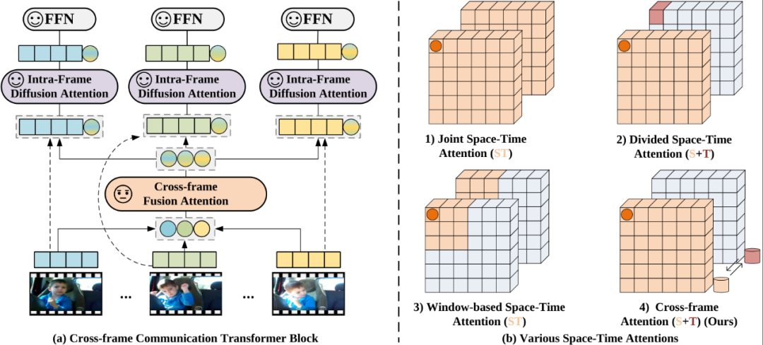 具体地,对每一帧编码时,动态地生成各自的 message token(如图 6(a)中彩色的圆形部分),携带所在帧的信息,再通过 Cross-frame Fusion Attention 交换不同帧的 message token 携带的信息,弥补了时序信息的缺失。具体地,如图 6(a)所示,在 CCT 的每一个 block 中,我们在 cls token 上施加线性变化得到 message token,每帧的 message token 通过 Cross-frame Fusion Attention(CFA)交换信息,