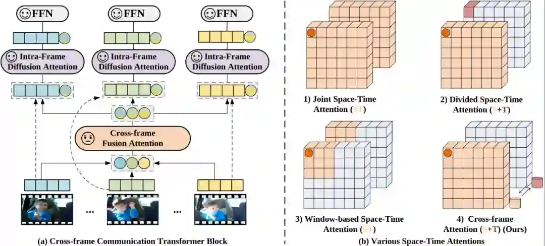 随后,每一帧的 message token 再回归到所属帧。通过 Intra-frame Diffusion Attention,每一帧内的 spatial tokens 在建模空间信息的同时,吸收了来自 message token 的全局时序信息,