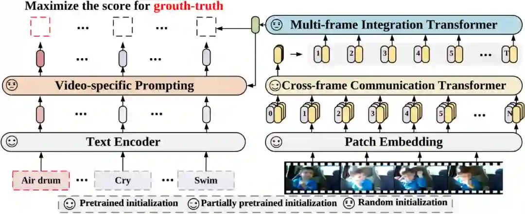 针对第一个问题,研究者提出了 Cross-frame Communication Transformer 和 Multi-frame Integration Transformer 模块,在预训练模型中引入时序信息;对于第二个问题,研究者提出了 Video-specific Prompting 机制,用于产生视频自适应的提示信息,充分地利用了类别标签中的文本信息。方法整体框架图如下图 5 所示。