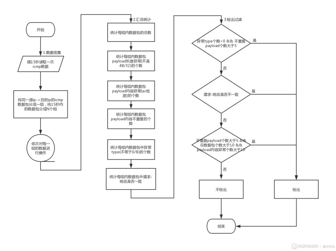 本文介绍了基于统计的检测ICMP隧道方法和落地实施中的一些技术细节。首先,基于统计的ICMP检测重点是需要了解ICMP隧道的工作原理和一些特征指标,只有较好的指标才能保证在真实环境中的检出效果。其次,为了达到在线实时检测,我们在文中介绍了结合Spark Streaming进行实时统计各种指标,检出超出阈值的数据。最后,通过分别对正样本和负样本进行测试,调整检出阈值,提高了检测准确度。
