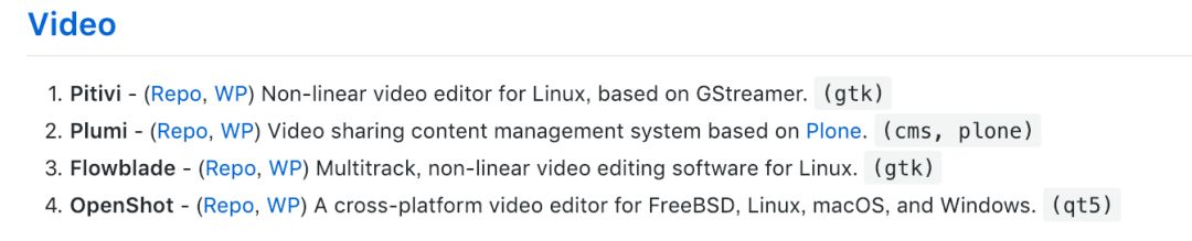 Pitivi 一个基于 GStreamer 的 Linux 非线性视频编辑器。Plumi 一个基于 Plone 的视频共享管理系统。OpenShot 支持 FreeBSD、Linux、masOS 和 Windows 的跨平台视频编辑器。