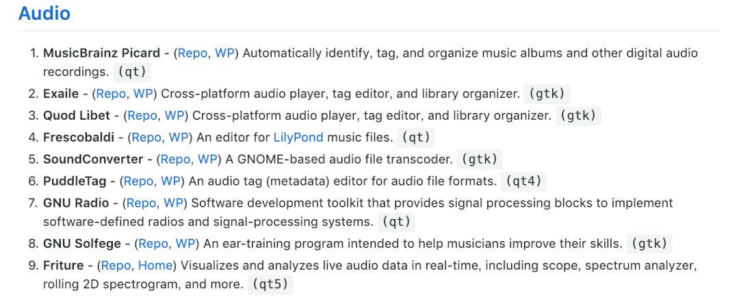 MusicBrainz Picard 可以自动识别、标记和组织音乐专辑或其他数字音频录音。SoundConverter 是一个基于 GNOME 的音频文件转码器。GNU Radio 是一个软件开发工具包,可以提供信号处理模块以实现软件定义的无线电和信号处理系统。Friture 可以实时恩熙和可视化音频数据,包括示波器、频谱分析仪等。