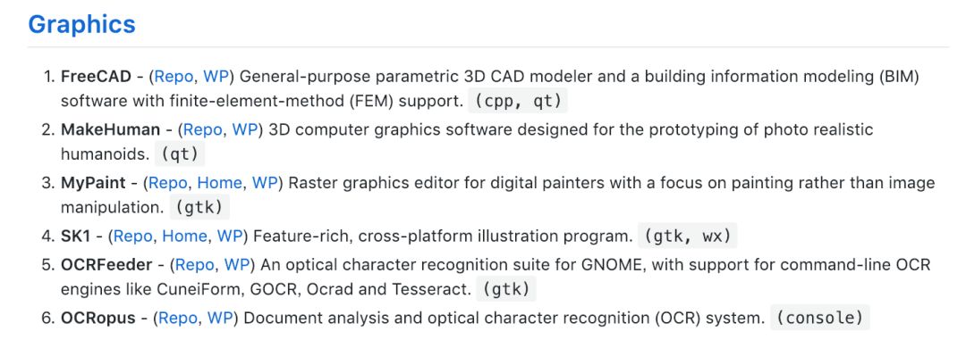 FreeCAD 一款通用参数化 3D CAD 建模与建筑信息建模(BIM)软件,可以支持 FEM。MakeHuman 是一款 3D 计算图形软件。SK1 是一个功能丰富的跨平台插图程序。OCRFeeder 是一组 GNOME 的光学字符识别套件,支持像 CuneiForm,GOCR,Ocrad 和 Tesseract 等命令行 OCR 引擎。