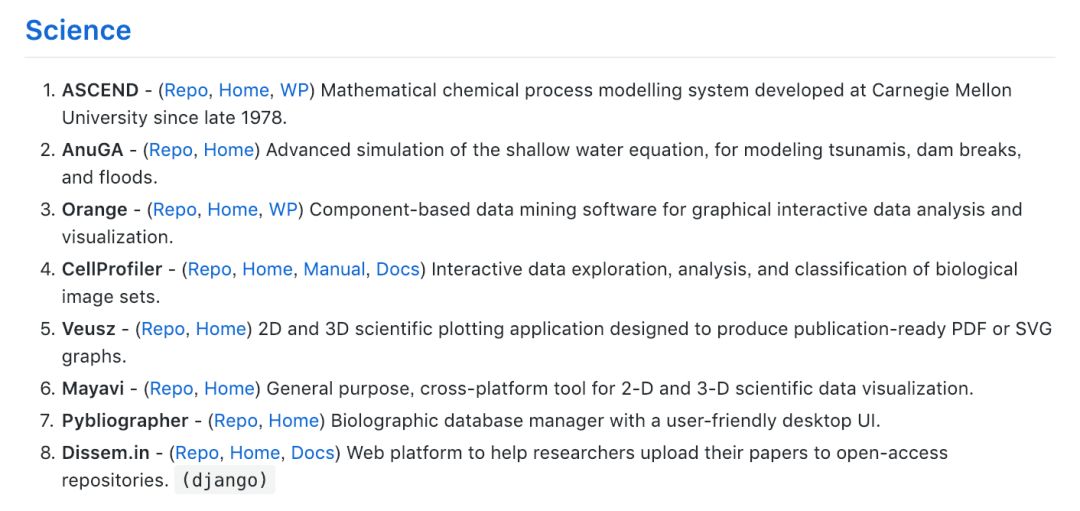 ASCEND 是 1978 年底卡内基梅隆大学开发的一个对化学现象进行数学分析的建模系统。Orange 是一款基于组件的数据挖掘软件,可用于图形交互式的数据分析与可视化。CellProfiler 是一个专门针对生物图像数据集的交互式数据探索,分析和分类软件。Pybliographer 提供了一个传记、文献书目的数据库管理器框架,具有用户友好的客户端UI。Dissem.in 可以帮助研究人员将他们的论文上传到开放库的 web 平台。