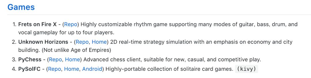 Frets on Fire X 一款高度可定制的节奏游戏,支持吉他、贝斯、架子鼓及人声等多种模式,并且可以支持四位玩家同时参与。Unknown Horizons 是一款 2D 实时策略模拟游戏,游戏场景主要围绕经济和城市建设。PyChess 一个高级国际象棋游戏的客户端,一款新颖、休闲并且具有竞争性的游戏。