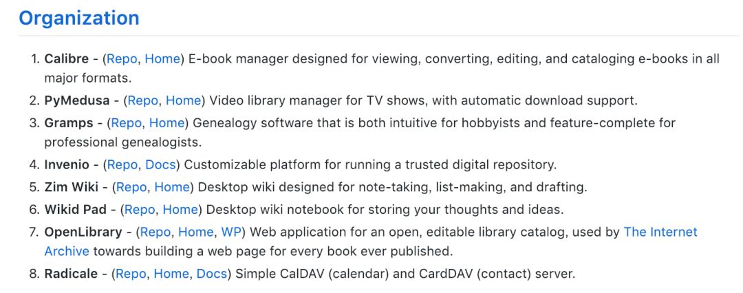 Calibre 是一个电子书管理器,有浏览、转换、编辑和分类电子书,主流格式的电子书都可以支持。PyMedusa 是一个电视节目的视频库管理器,并且可以自动下载。Zim Wiki 是专为记笔记、制作列表和绘图而设计的。OpenLibrary 是一个 Web 应用程序,是 Internet Archive 用来给每一本出版的图书构建网页。
