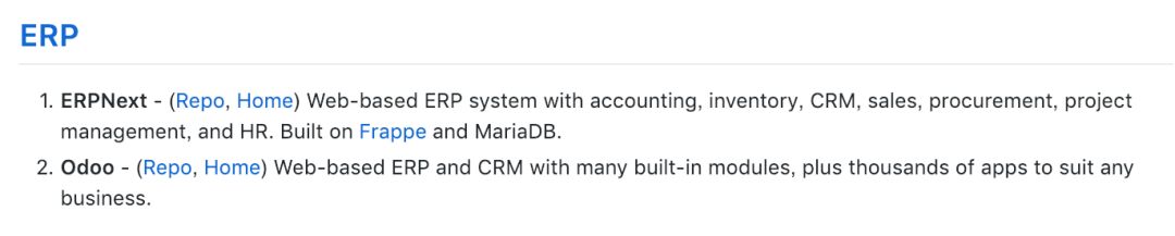 ERPNext 是一个基于 Web 开发的 ERP 系统,包括会计、库存、CRM、销售、采购、项目管理和人力资源等模块。Odoo 也是一个基于 Web 开发的 ERP 和 CRM,拥有许多内置模块,以及数千个应用程序,可以用于任何业务。