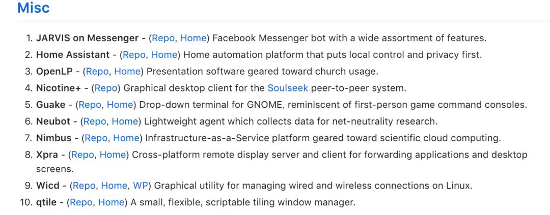 JARVIS on Messenger 是一个具有各种各样功能的 Facebook Messenger机器人。Home Assistant 一个优先考虑本地控制和隐私的家庭自动化平台。OpenLP 是一款面向教会使用的演示软件。Wicd 一款可用于管理 Linux 上有线和无线连接的图形程序。Neubot 是一个可为网络中立性研究收集数据的轻量级代理。