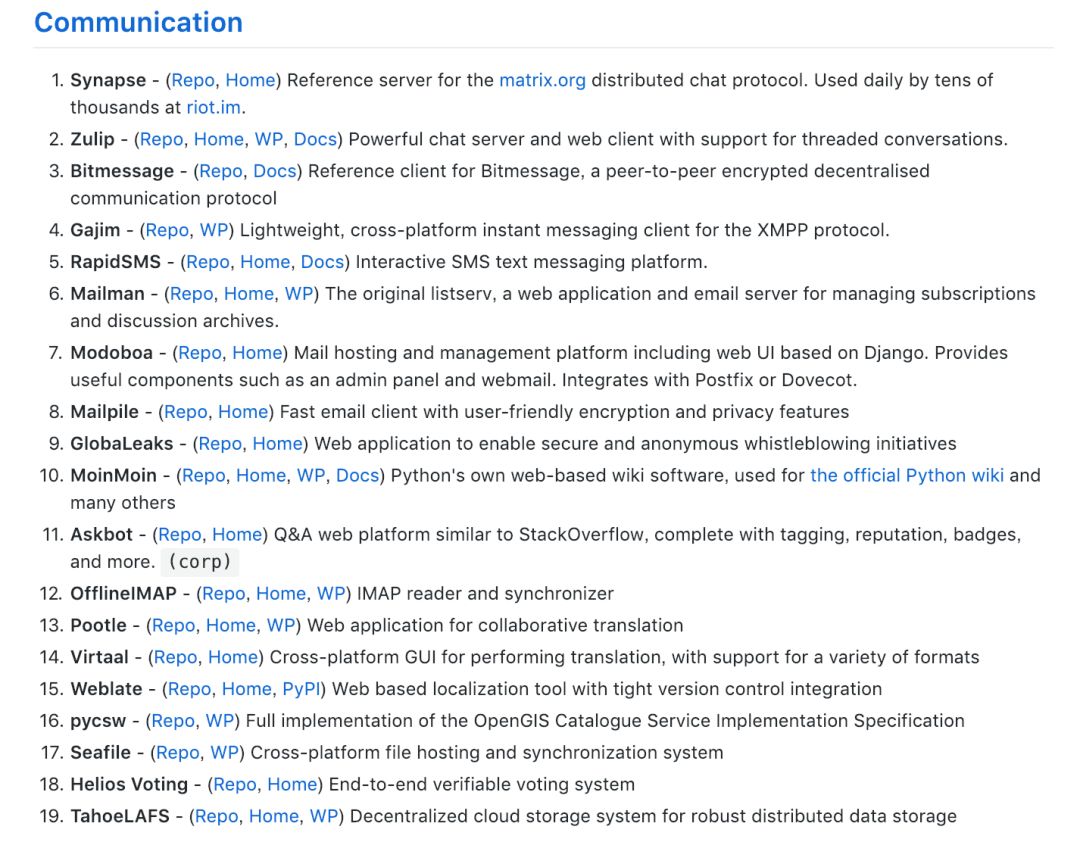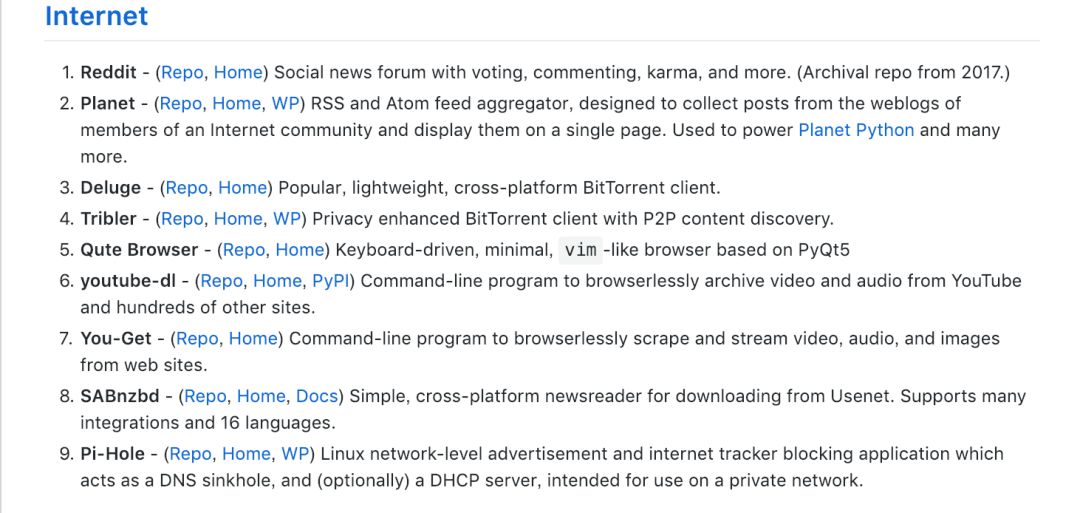 Reddit,很多小伙伴应该都会 Reddit 不陌生。一个社交新闻论坛,有投票、评论等功能。Planet,一个 RSS 和 Atom feed 的聚合器,收集社区成员的博客帖子并显示在页面上。Deluge 是一个流行、轻量级、跨平台的 BitTorrent 客户端。Qute Browser 基于 PyQt5 的键盘驱动、最小、类似 vim 的浏览器。youtube-dl 命令行程序,不用在浏览器中就可以从 YouTube 和 其他数百个网站上存档视频和音频。You-Get 命令行程序,不用在浏览器中就可以从网页上爬取流视频、音频和图像。SABnzbd 一个简单,跨平台的新闻阅读器,可以从 Usenet 下载,支持多种集成和 16 中语言。
