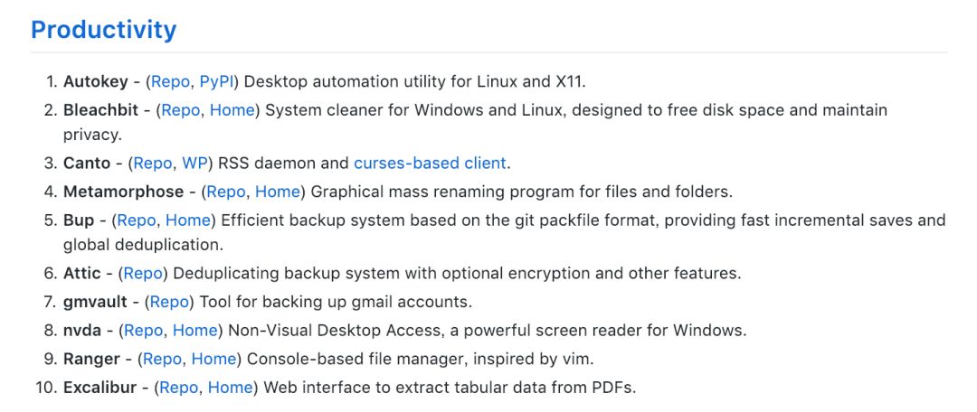 Autokey 是一款适用于 Linux 和 X11 的桌面自动化实用程序。Bleachbit 是一个适用于 Windows 和 Linux 的系统清理工具,帮助释放磁盘空间和保护隐私。gmvault 可用于备份 Gmail 账户。Excalibur 可以从 PDF 文件中提取表格数据。