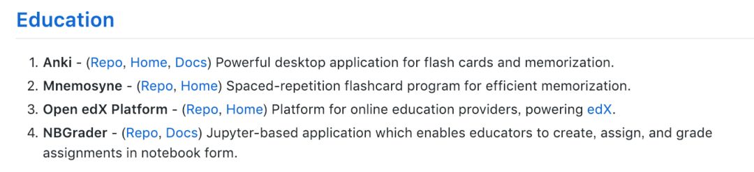 Anki 一款用于闪存和存储的桌面应用程序。Mnemosyne 是一个用于高效存储的间隔闪卡程序。Open edX Platform 是一个在线教育提供商平台,支持 edX。NBGrader,一个基于 Jupyter 的应用程序,使教师能以 notebook 形式创建,分配作业,并给作业评分。
