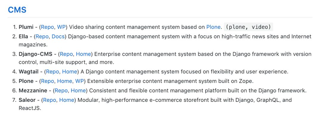 Ella 是一个基于 Django 的内容管理系统,主要关注高流量新闻的网站和互联网杂志。Django-CMS 是一个基于Django框架的企业内容管理系统,具有版本控制,多站点支持等功能。Wagtail,一个专注于灵活性和用户体验的Django内容管理系统。Mezzanine 是一个基于 Django 框架构建的内容管理平台,注重灵活性和用户体验。Saleor 一个使用Django,GraphQL 和 ReactJS 构建的模块化、高性能电子商务平台。