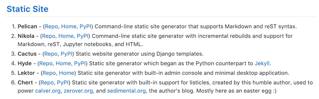 Pelican 一个命令行静态站点生成器,支持 Markdown 和 reST 语法。Nikola 是一个带有增量重建的命令行静态站点生成器,可以支持 Markdown,reST,Jupyter Notebook和 HTML。Cactus 是一个使用 Django 模板的静态网站生成器。Lektor 一个静态站点生成器,其中内置管理控制台和小型桌面应用程序。